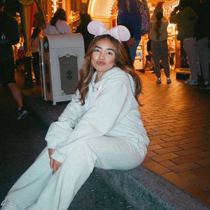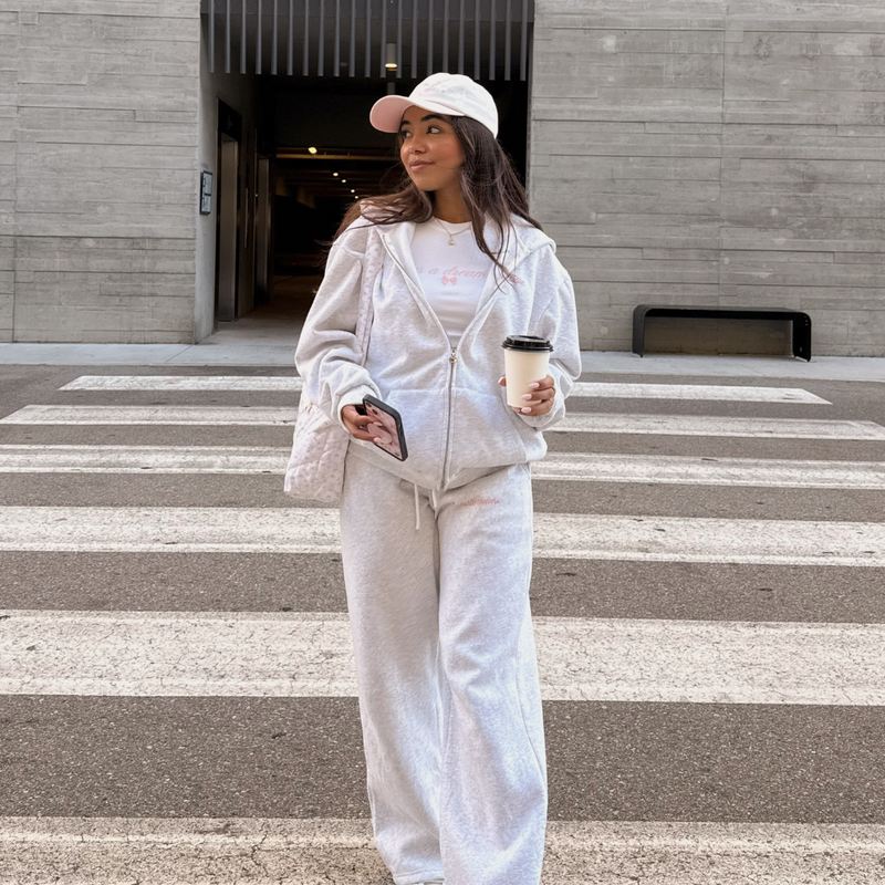 The Castle Cutie Sweatpants are soft gray fleece lined sweatpants with an adjustable drawstring hem. Straight leg fit with loose oversized fit. It has functional pockets and an exclusive "castle cutie" design in pink with cute pink sparkles on the side. Made from stretchy fabric, these sweatpants offer a comfortable fit. Cassi rolls her sweats down once for a better fit.