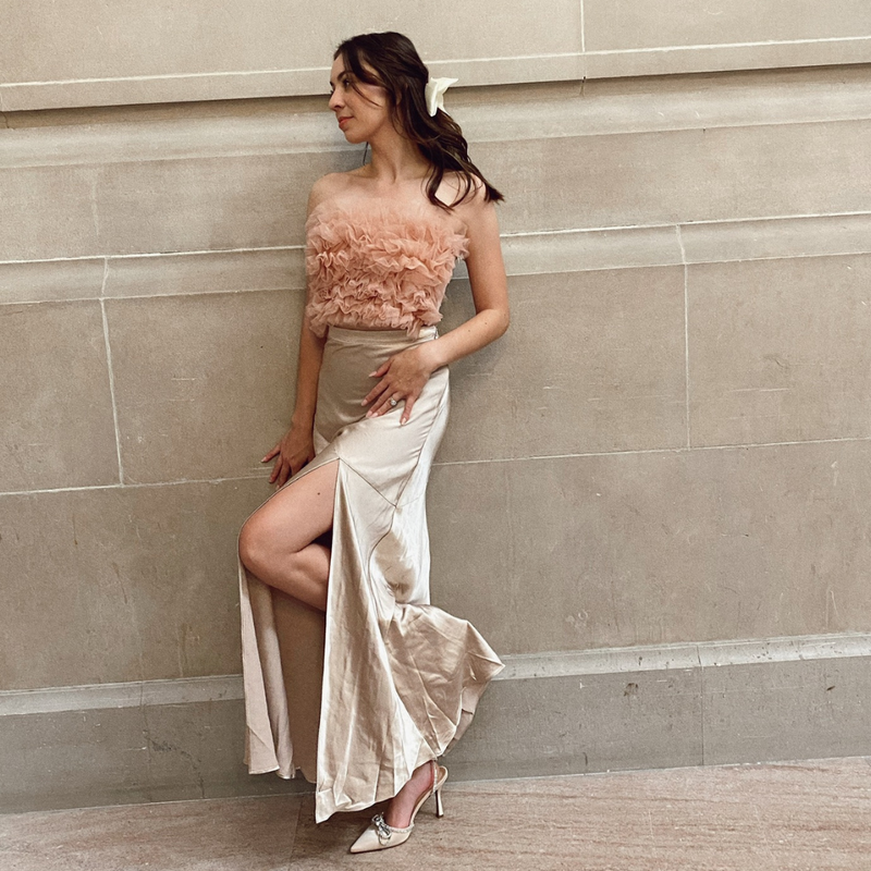 Our Cheers Me Maxi Skirt is side slit slip skirt. It features a high waist, maxi length, and a side zipper closure. It also displays a shiny soft gold satin material.