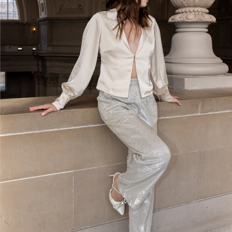 Our To The Disco Trousers are a pair of high waist sparkly silver trousers. They feature a relaxed fit, side zipper closure, and pleating towards the top. Pair it with our To The Disco Crop Top and Blazer for the cutest matching set look!