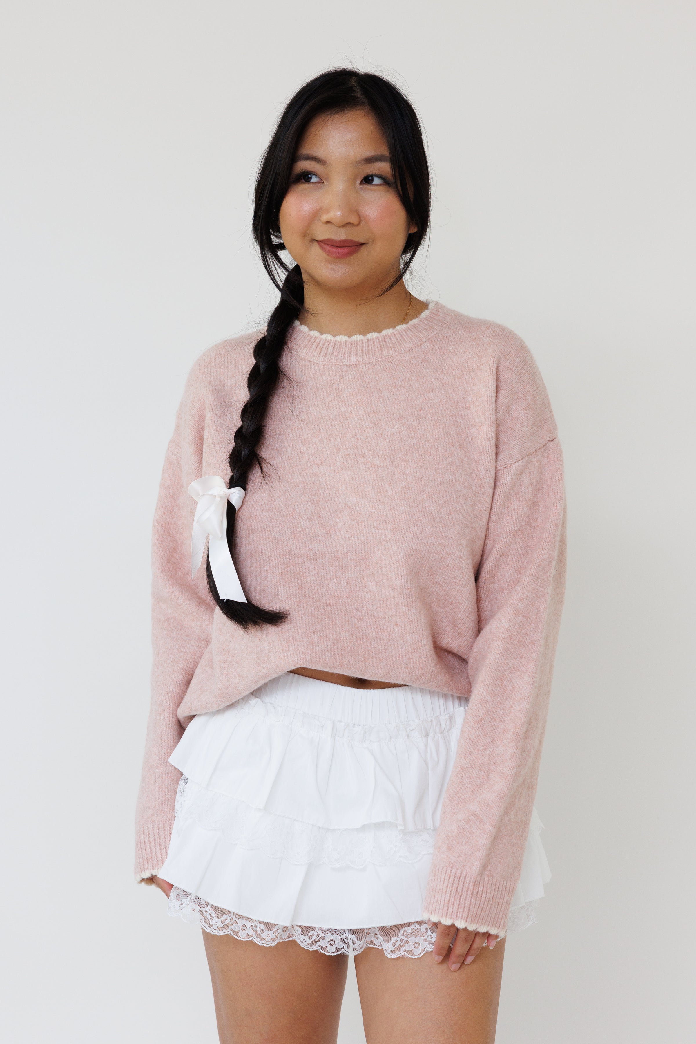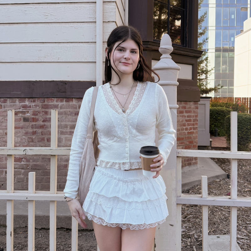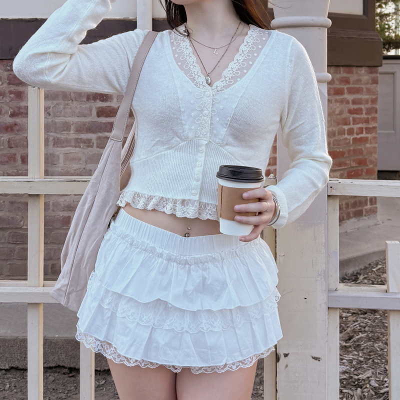 Our Rue Belle Skort is a white tiered lace skort with floral lace detailing and a layered ruffle design. It has an elastic waistband for a comfortable fit and a lightweight feel that makes it easy to move in. The structured shape keeps it polished while maintaining a soft look. It’s a versatile piece that pairs effortlessly with your favorite tops and sweaters.