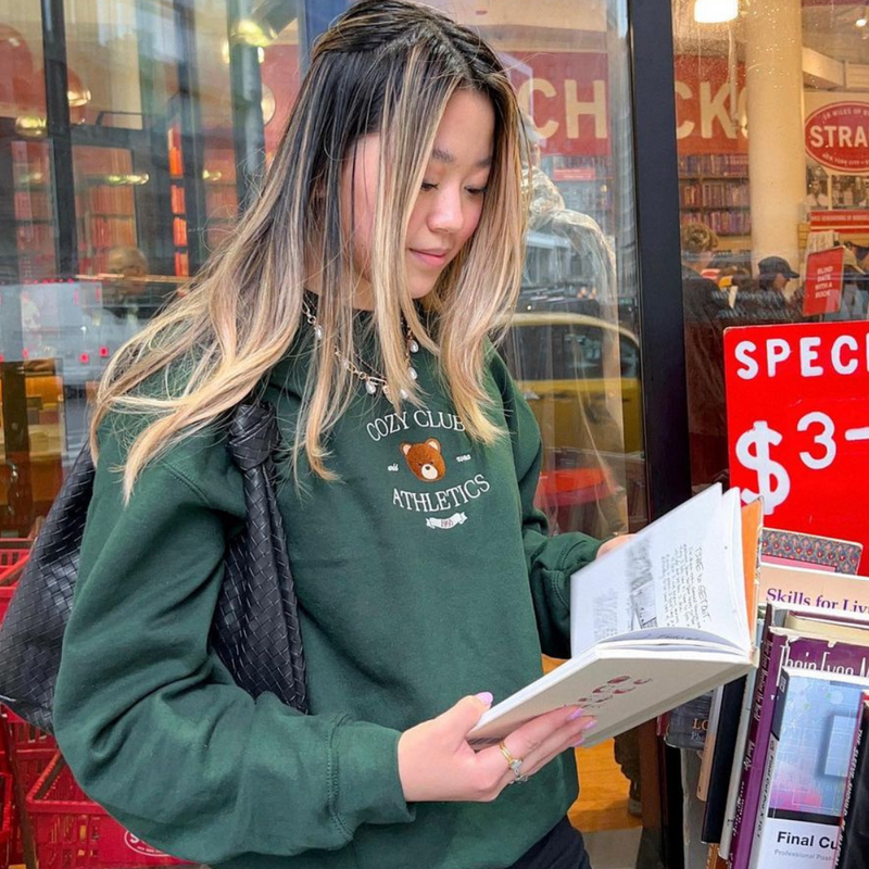 EXCLUSIVE Cozy Club Athletic Crewneck Sweater with embroidered design. Forest green crewneck sweatshirt with fleece lining. Unisex sizing.