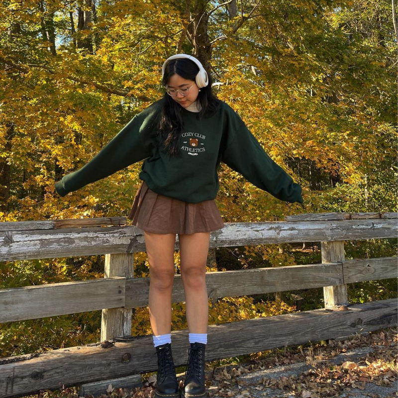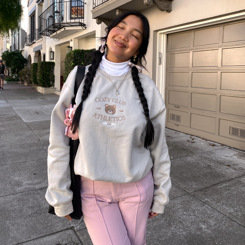 EXCLUSIVE Cozy Club Athletic Crewneck Sweater with embroidered design. Beige tan crewneck sweatshirt with fleece lining. Unisex sizing.