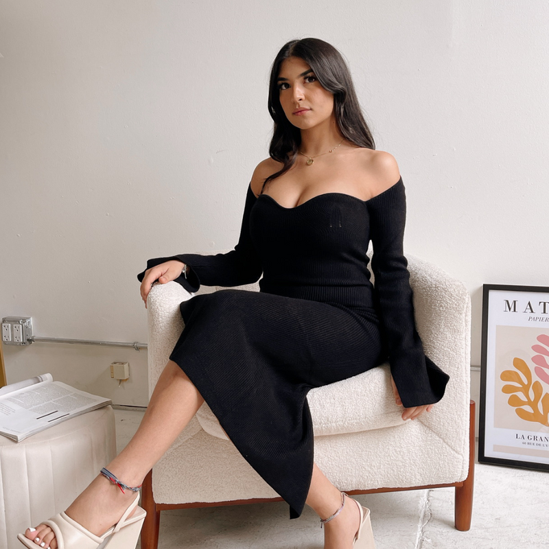 Our Espresso Martini Knit Dress in black is a body hugging midi dress. It flares out at the bottom and has big bell sleeves. It has a wide neckline which dips into a slight sweetheart neckline. It features a very thick ribbed material that will keep you super warm. It also displays a high slit for added body.
