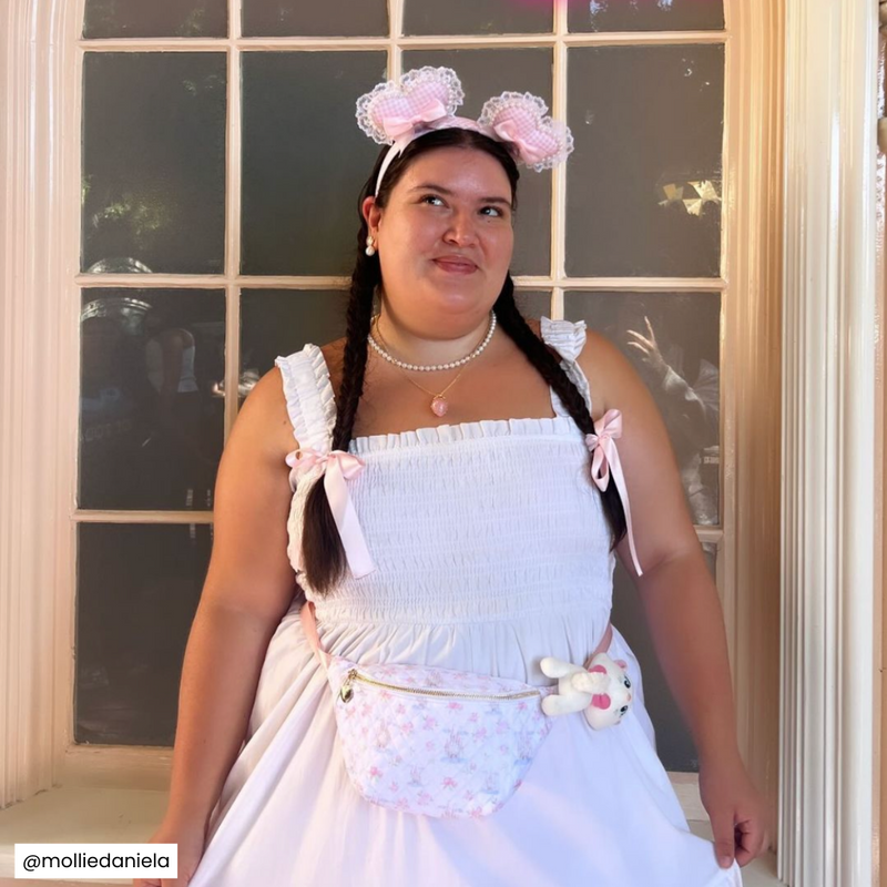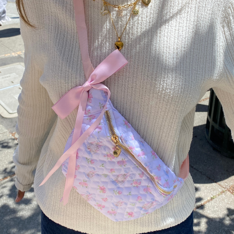 Fanny belt bag in exclusive castle and rose pattern. Quilted and lined in white, and features a heart zipper pull. Waterproof and easy to clean nylon. It displays gold hardware, a gold zipper pull, an inner zipper pocket, a pink belt strap, and a back zipper pocket.