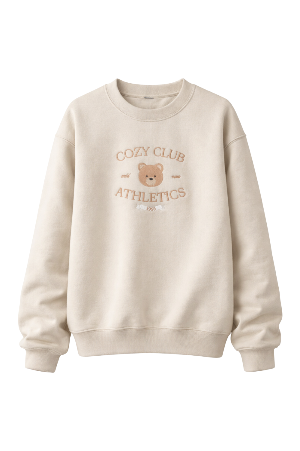 EXCLUSIVE Cozy Club Athletic Crewneck Sweater with embroidered design. Beige tan crewneck sweatshirt with fleece lining. Unisex sizing.