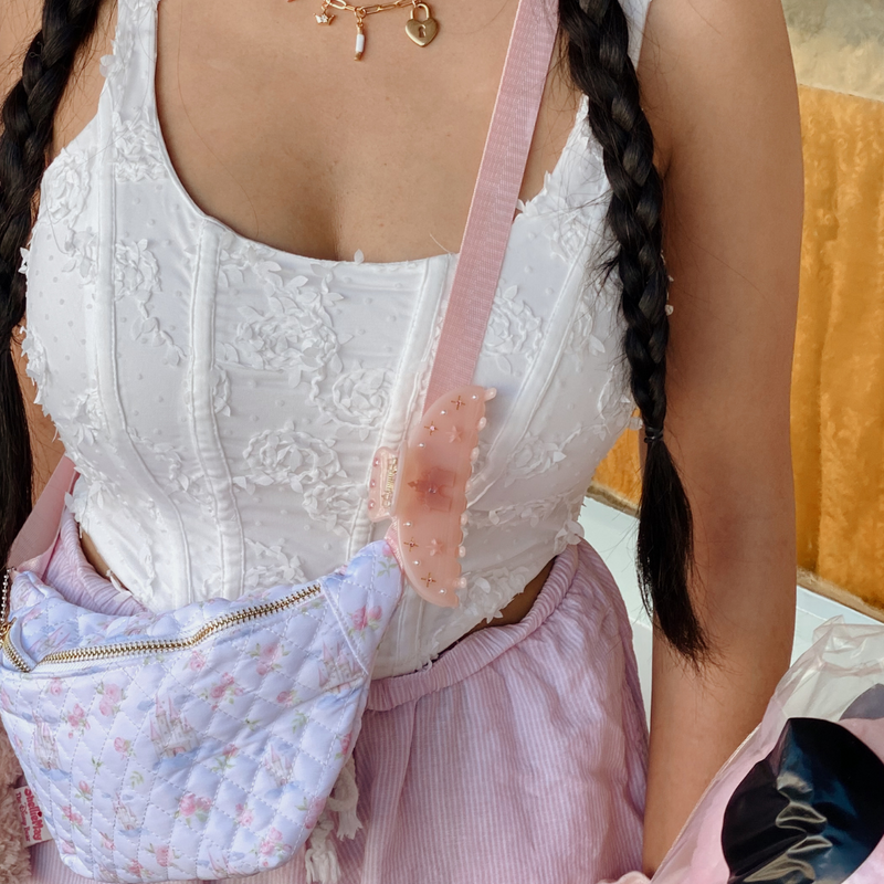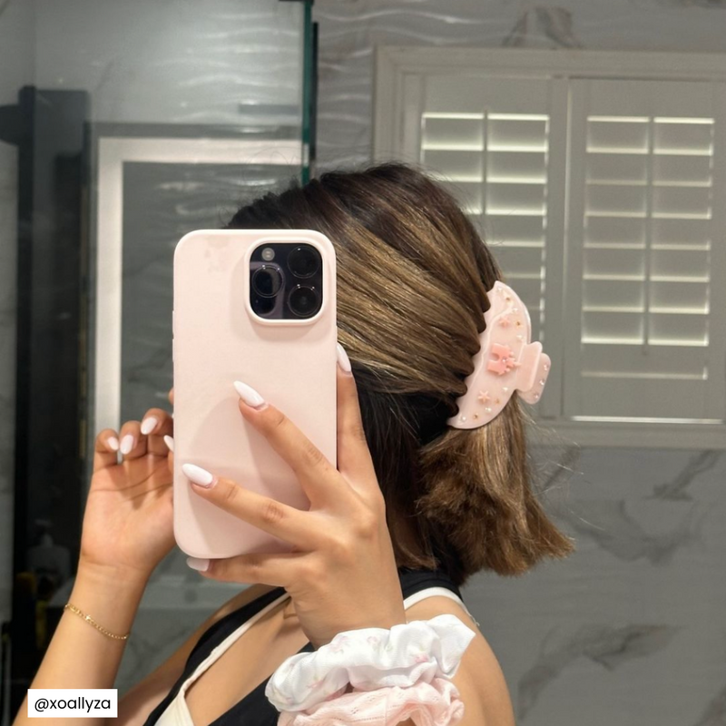 Our Princess Claw Clip is an exclusive pink hair claw clip made with the strongest materials. It features pearl and rhinestone accents, with a castle and stars embellishment at the center. Design is on both sides.
