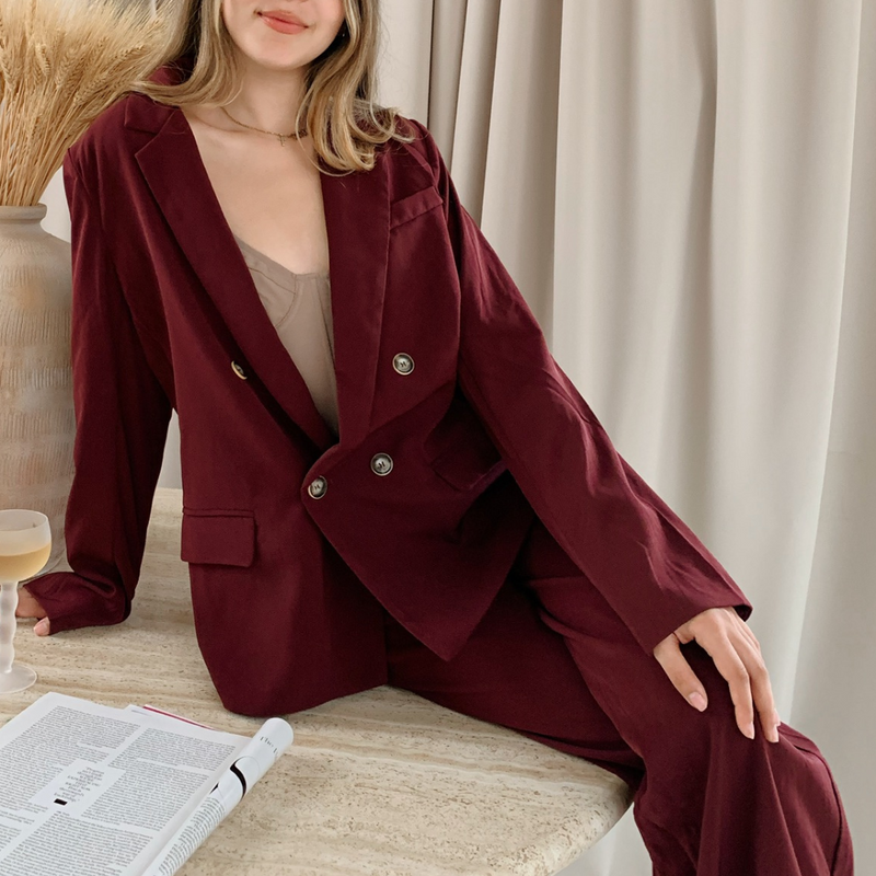 Our Run Down Blazer in maroon is a double breasted, oversized fit boxy blazer. It is fully lined, features covered functional pockets, and has sleeve buttons. Pair it with our Run Down Trouser for the trendiest matching pantsuit look!