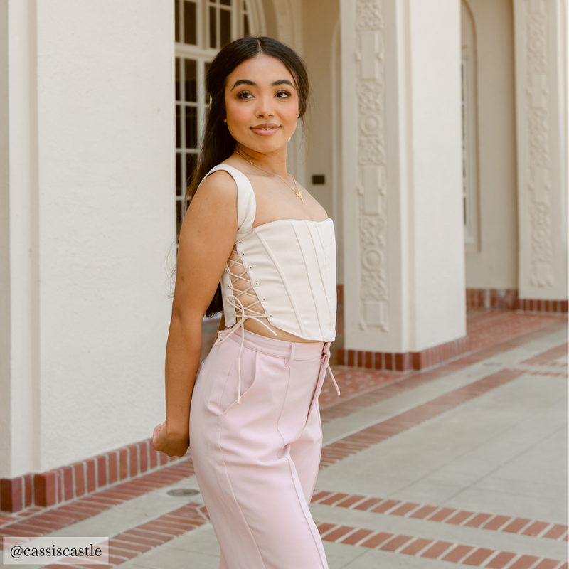 Our Adore You Corset Top in cream is a structured, corset style cropped top. It features boning detail and a criss cross tie closure on each side. This top is fitted with minimal stretch. Pair it with any bottoms for a simple, yet elevated look!