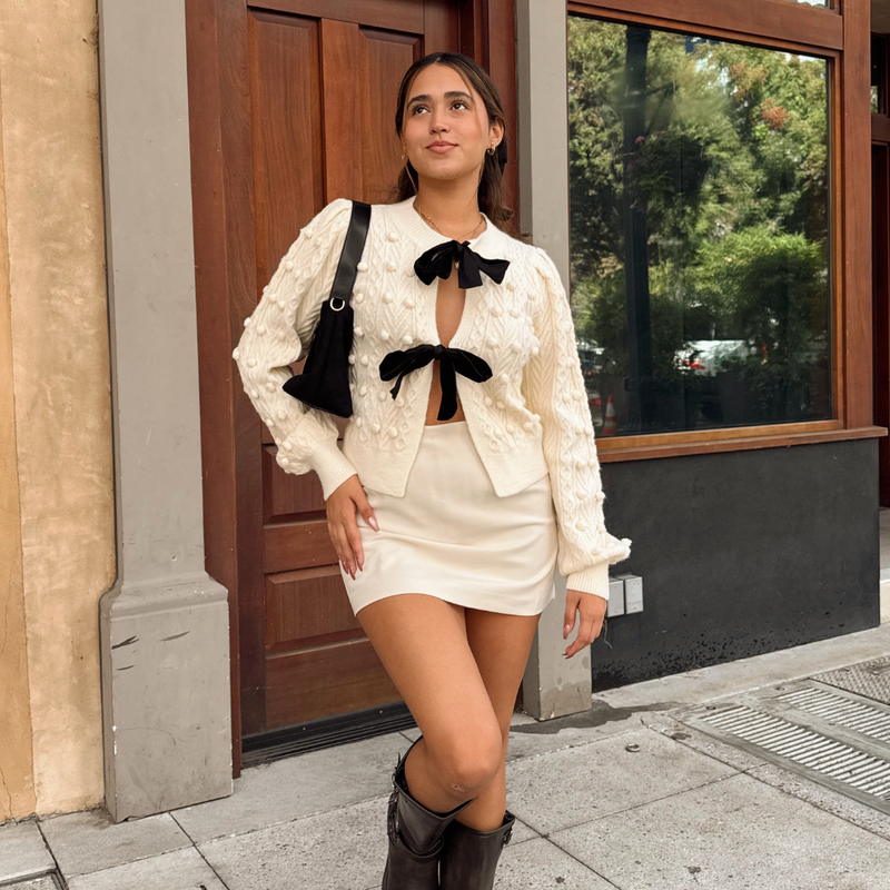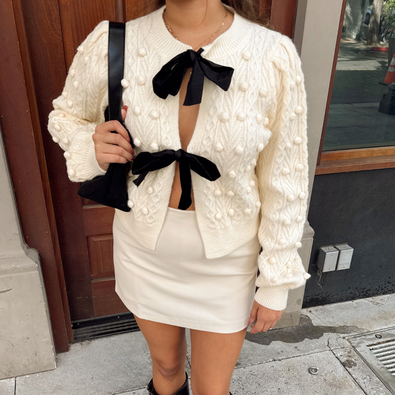 Our Last Wishes Cardigan is a bow-front cable knit cardigan. It features an open-front relaxed fit with black velvet bow ties. It displays a cable knit pattern with pom poms throughout the body and sleeves. It also has a gathered puff shoulders and long sleeves.
