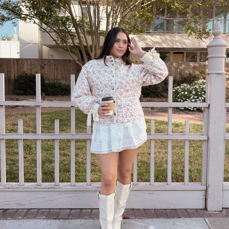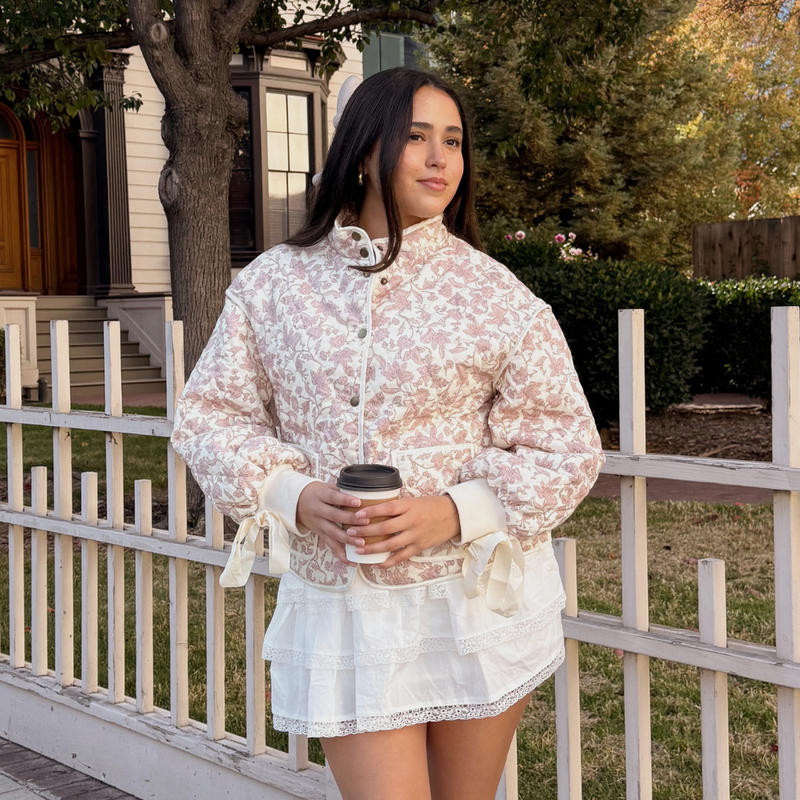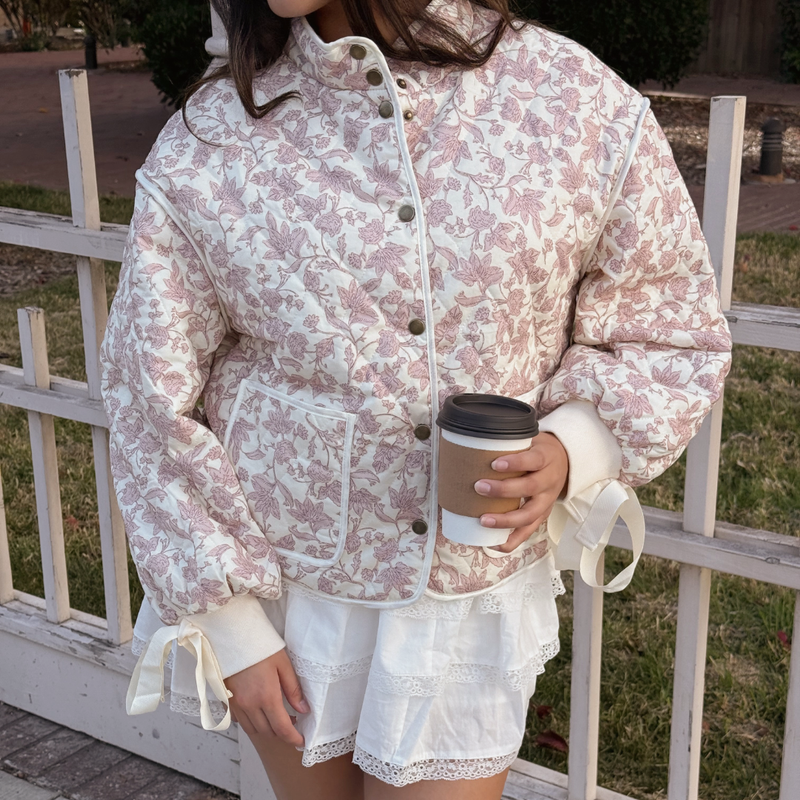 Our Mademoiselle Jacket is a pink floral quilted jacket. It features a high neck stand collar and brass snap closures down the front. It has a contrast binding trim throughout. Plus, it includes functional patch pockets. With drop shoulder long balloon sleeves and cute tying ribbon details on the cuffs. Fully lined and it has a boxy fit.